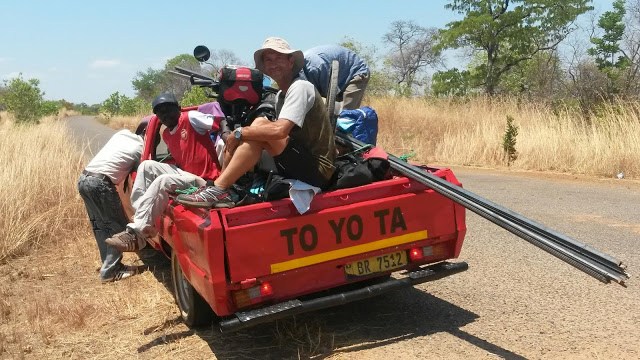 On nous déconseille fortement de pas traverser la réserve en vélo. Après deux heures d’attente à la barrière, nous optons pour le transport en camionnette. Mais le transport en Afrique est bien différent de notre façon de raisonner. Tout contents, on embarque les vélos et nous voilà partis à travers la réserve, cheveux au vent.