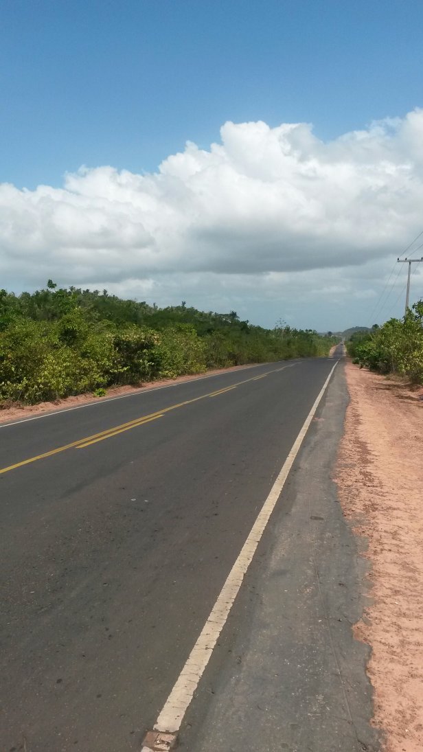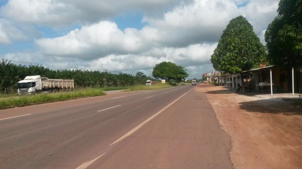 Dernière ligne droite avant d’arriver à Bélem. 80 kms séparent ces deux villes. C’est déja la banlieue, et la circulation grandissante de poids lourds, autobus et motos s’intensifient.