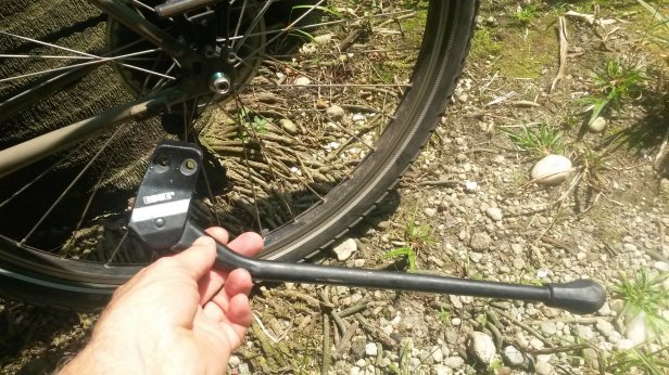 Les photos du vélo seront désormais sans béquille. Elle a cédé sous le poids des sacoches. Mais les vis se sont brisées nettes et sont restées dans les pas de vis. Comme si vous cassiez votre clef, dans la serrure. Personne ne veut le réparer. Éric et Line de « mode cyclabe à Nice : S.O.S préparez la chignole 🙂