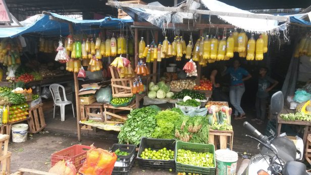 Pour s’approvisionner, les marchés regorgent de fruits et de légumes. Ces bouteilles plastic oranges suspendues, contiennent une fabrication « piment fais maison ».