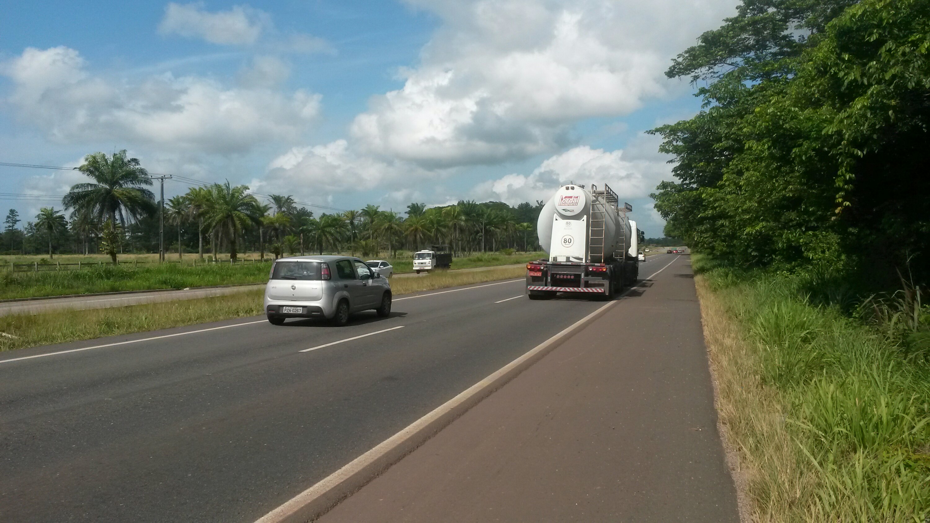 Dernière ligne droite avant d’arriver à Bélem. 80 kms séparent ces deux villes. C’est déja la banlieue, et la circulation grandissante de poids lourds, autobus et motos s’intensifient.