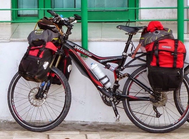 Voici mon premier vélo de randonnée un VTT Spécialized de 2007 équipé pour le cyclotourisme avec une modification amenée au niveau du cadre, une patte soudée sous la selle pour mieux équilibrer le lourd poids des sacoches arrières sur le centre du vélo.