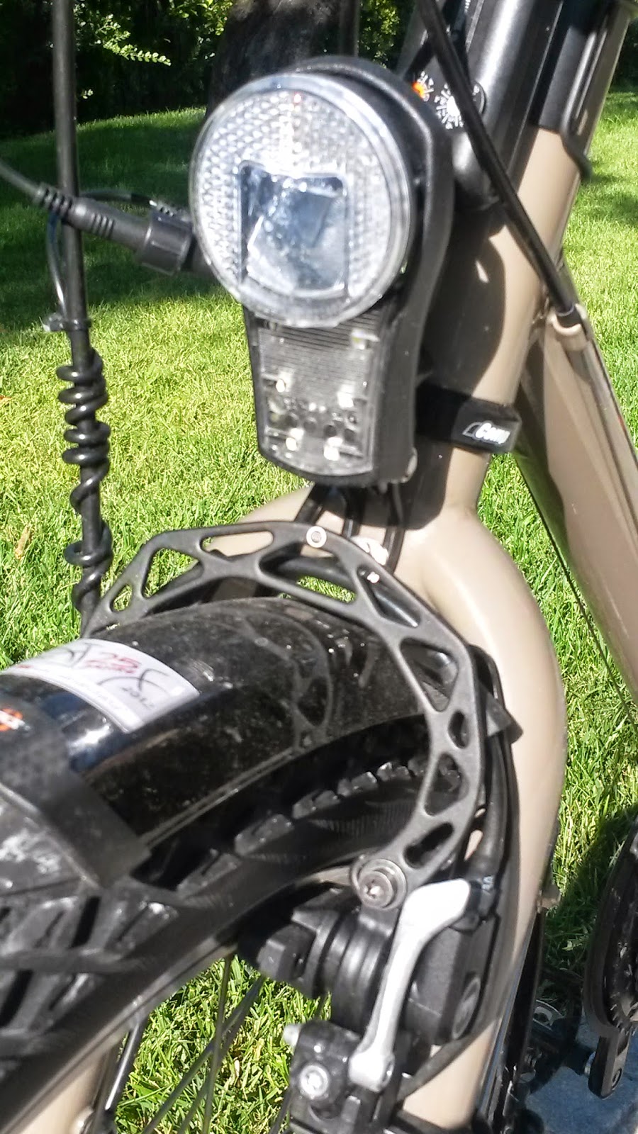 Branché sur le moyeu de la roue avant, cet appareil permet de recharger en roulant un téléphone mobile ou autre appareil avec clé USB.